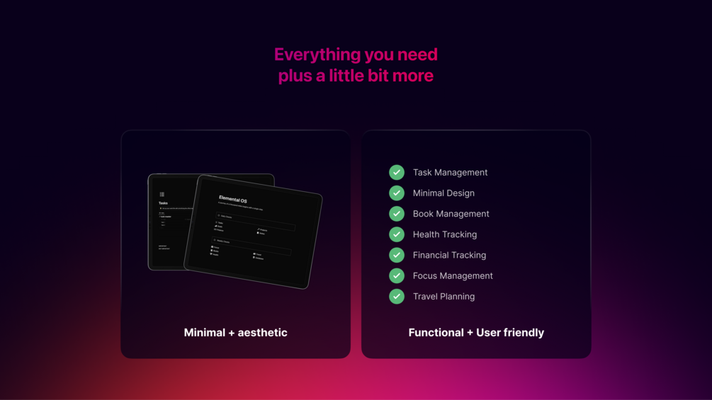 Tired of juggling multiple templates from various sources to make your notion work for you? Look no further. Elemental OS is the solution you've been searching for. With all the essential tools for daily life management and tracking, it saves you time, increases productivity, and promotes a sense of balance and calm.